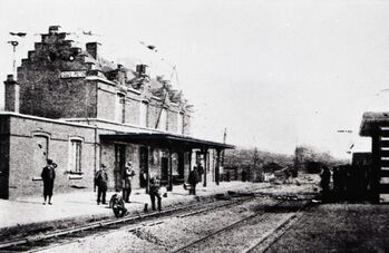 BeschrijvingReproductie van een postkaart zonder opschrift. De postkaart toont de zij- en achtergevel met luifel van het station. Spoorwegpersoneel poseert op de perrons en de sporen.