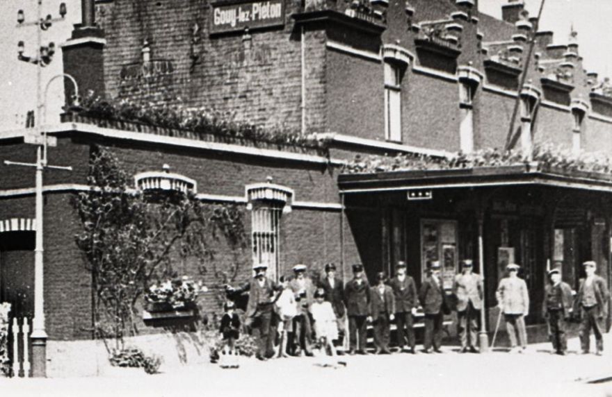 BeschrijvingReproductie van een postkaart zonder opschrift. De postkaart toont de achtergevel van het station. Stationspersoneel en reizigers poseren op het eerste perron voor de luifel.