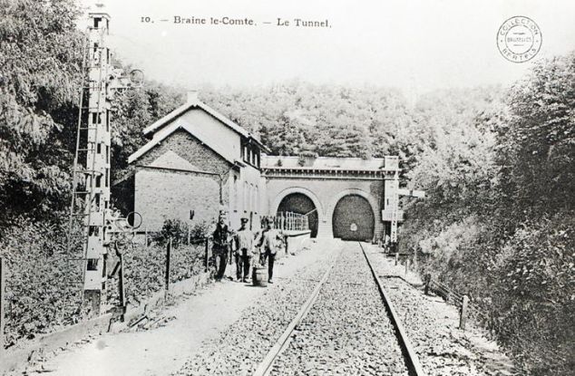 Reproductie van een postkaart met als opschrift '10. - Braine le-Comte. - Le Tunnel.' De postkaart toont de zuidelijke ingang van de tunnel, met twee kokers, waarvan slechts één in dienst was. De linkse koker was tijdens het bouwen in 1840-'41 immers ingestort. Voor de tunnel staat een gebouw. Naast het spoor poseert spoorwegpersoneel. Op het voorplan zien we het onderste deel van een seinpaal.
