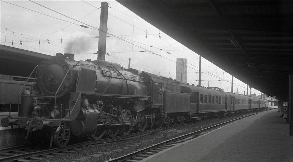 Deze foto toont de linkerzijde van stoomlocomotief 29.220, behorend tot het type 29 (1D Consolidation). De locomotief staat aan het perron in station Brussel-Zuid en trekt enkel K-rijtuigen. De trein wordt geduwd door elektrische locomotief 122.024. Links vooraan zien we het perron met haar luifel en op de achtergond de oude uurwerktoren van het station.