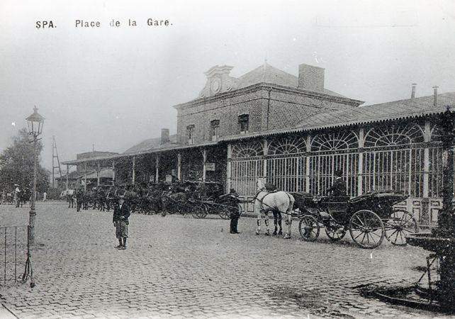 BeschrijvingReproductie van een postkaart met als opschrift 'Spa. Place de la Gare'. De postkaart toont de voorgevel van het station met ervoor verschillende paardenkoetsen.