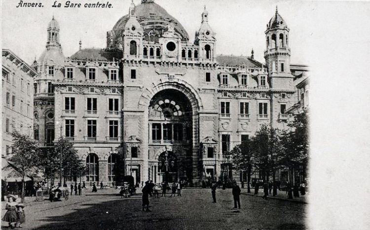 Reproductie van een postkaart met als opschrift 'Anvers. - La Gare Centrale.' De postkaart toont de zijgevel van het stationsgebouw, gefotografeerd vanop De Keyserlei. Voorbijgangers poseren voor het stationsgebouw.