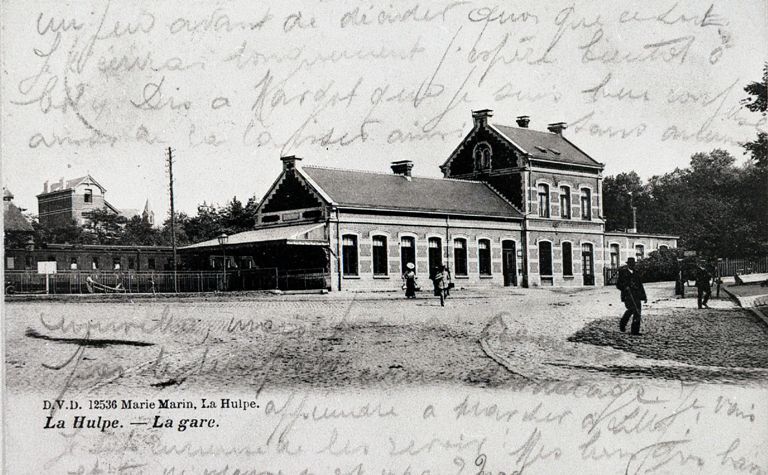 Reproductie van een postkaart met als opschrift 'La Hulpe. - La Gare. D.V.D. 12536 Marie Marin. La Hulpe.' We zien de voor- en zijgevel met luifel van het station. Een deel van de rijtuigen op het eerste perron is zichtbaar. Op de voorzijde van de postkaart staat een uitgebreide handgeschreven boodschap.