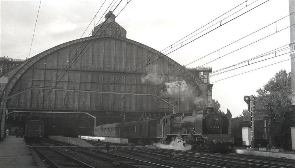 Stoomlocomotief 7.054 verlaat station Antwerpen-Centraal
