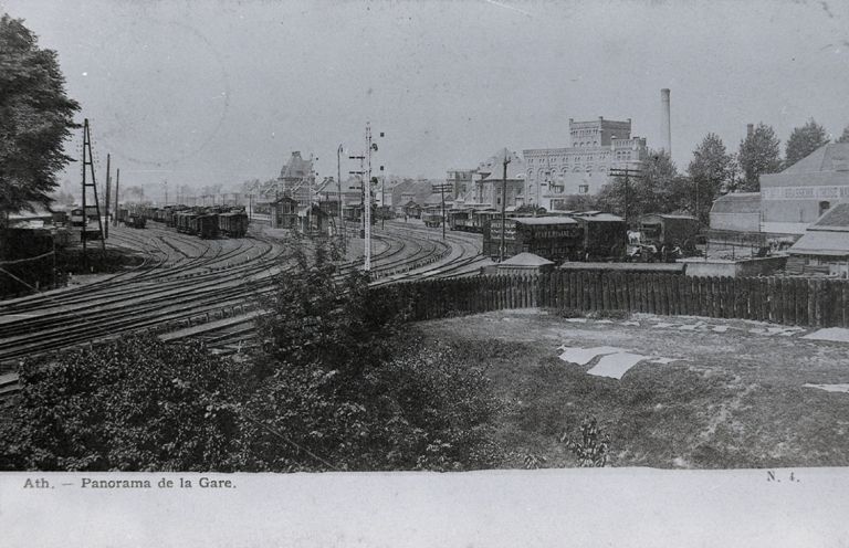 Reproductie van een postkaart met als opschrift 'Ath. - Panorama de la Gare. N. I.' De foto toont het sporencomplex en verschillende goederentreinen. Op de achtergrond staat het station. Op de voorgrond een mechanisch sein.