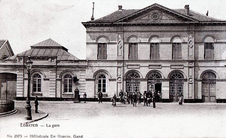BeschrijvingReproductie van een postkaart met als opschrift 'Lokeren - La gare N° 2979 - Héliotypie De Graeve. Gand'. De foto toont de voorgevel van het station. Enkele personen poseren op het stationsplein.