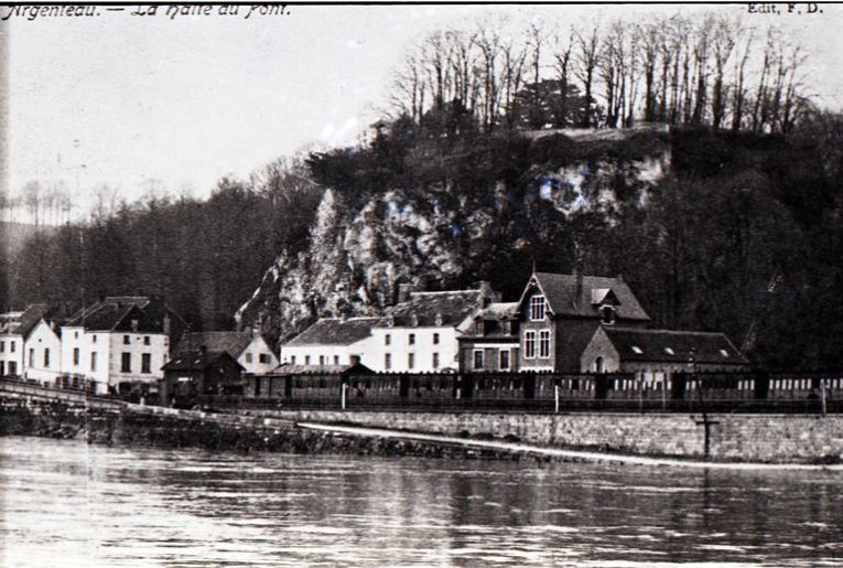 BeschrijvingReproductie van een postkaart met als opschrift 'Argenteau. - La halte au Pont. Edit, F.D.' De foto toont een reizigerstrein op de kade bij een rij woningen, gefotografeerd vanover de Maas.