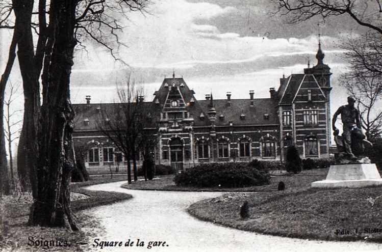 BeschrijvingReproductie van een postkaart met als opschrift 'Soignies - Square de la gare.' De foto toont de voorgevel van het station met ervoor een parkje waarin een standbeeld staat.