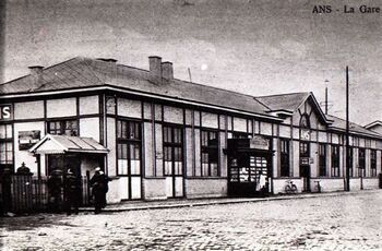 BeschrijvingReproductie van een postkaart met als opschrift 'Ans - La Gare'. De postkaart toont een deel van de voorgevel van het stationsgebouw met links een toegang tot de perrons. Voor de gevel staat een krantenkiosk.