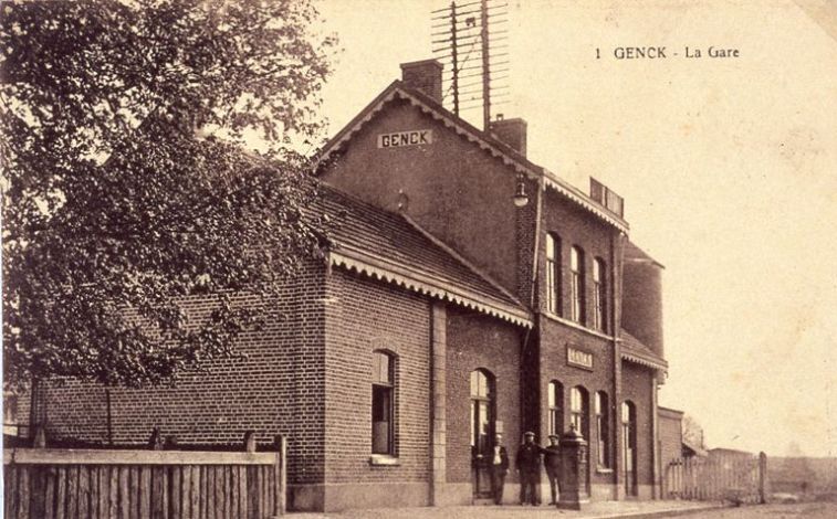 BeschrijvingReproductie van een postkaart met als opschrift '1. Genck - La Gare'. De postkaart toont de zij- en voorgevel van het station. Voor de ingang poseren drie personen bij een postbus.