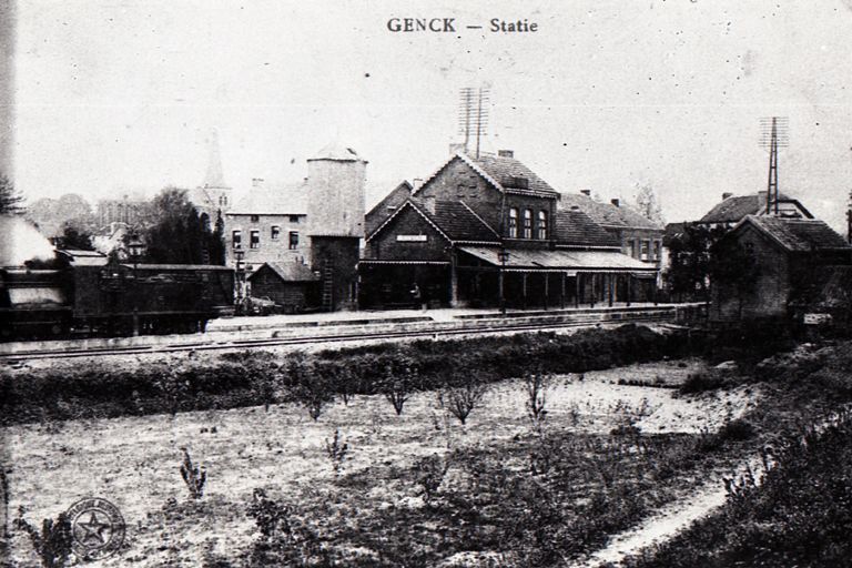 Reproductie van een postkaart met als opschrift 'Genck - Statie'. De postkaart toont de achtergevel met luifel van het station. Links van de gebouwen staat een watertoren. Op het eerste spoor zien we de neus van een stoomlocomotief.