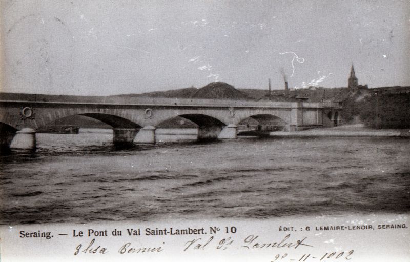 Reproductie van een postkaart met als opschrift 'Seraing. - Le Pont du Val Saint-Lambert. N° 10 Edit. : G Lemaire-Lenoir, Seraing.' De postkaart toont een brug over de Maas. Onderaan de kaart staat een handgeschreven boodschap en de datum '29-11-1902'.