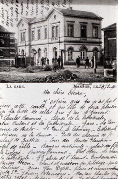 Reproductie van een postkaart met als opschrift 'La Gare. Manage, le.....' De postkaart toont de zij- en voorgevel van het station. Op de voorgrond lopen enkele voorbijgangers. In de witruimte onderaan de kaart staat een uitgebreide handgeschreven en gedateerde (25/2.90) boodschap.