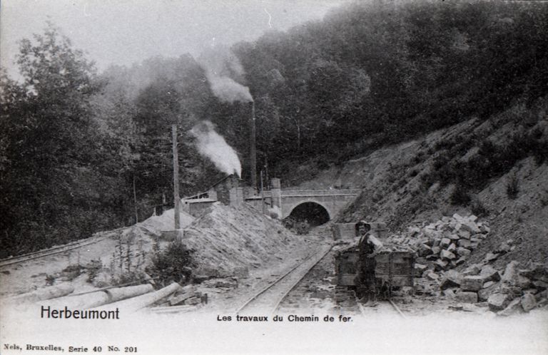 Reproductie van een postkaart met als opschrift 'Herbeumont Les travaux du Chemin de fer.' en als uitgever 'Nels, Bruxelles, Serie 40 N° 201'. Op de voorgrond poseert een arbeider bij een smalspoorwagen tijdens de aanleg van lijn 163a (Bertrix - Franse grens). Op de achtergrond zien we in de uitgraving de tunnel in opbouw.