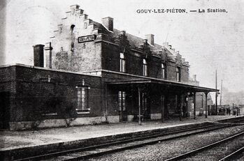 BeschrijvingReproductie van een postkaart met als opschrift 'Gouy-lez-Pieton. - La Station.' De postkaart toont de zij- en achtergevel met luifel van het station.