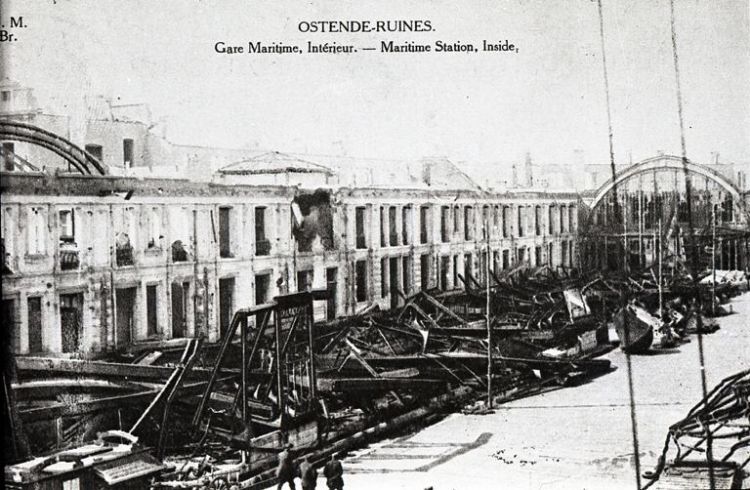 Reproduction d’une carte postale portant l’inscription «Ostende-Ruines. Gare Maritime, Intérieur. - Maritime Station, Inside ». On y voit la façade latérale des ruines de la gare, devant laquelle se trouvent les restes de la marquise.