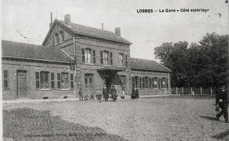 Reproductie van een postkaart met als opschrift 'Lobbes - La Gare - Côté extérieur Collection Dolders Tenret, Hotel du Nord, Lobbes'. De postkaart toont de voorgevel van het station. Enkele personen staan op het stationsplein.