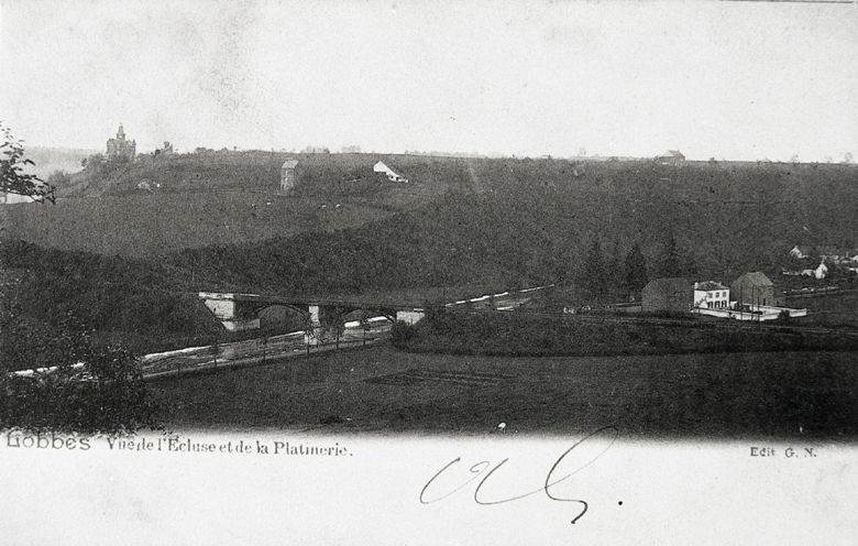 Reproductie van een postkaart met als opschrift 'Lobbes vue de l'Ecluse et de la Platinerie. Edit G.N.' De postkaart toont een luchtfoto van een metalen spoorwegbrug met stenen peilers over de Samber. Onderaan de kaart staat een handtekening.