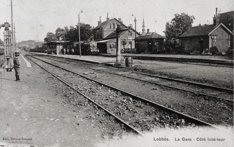 Reproductie van een postkaart met als opschrift 'Lobbes. La Gare - Côté Intérieur Edit. Ursmer-Dehoux'. De postkaart toont de zij- en achtergevel van het station, gefotografeerd van over de sporen. Aan het eerste perron staat een stoomtrein. Op de tussenperrons zien we telkens een waterkolom.