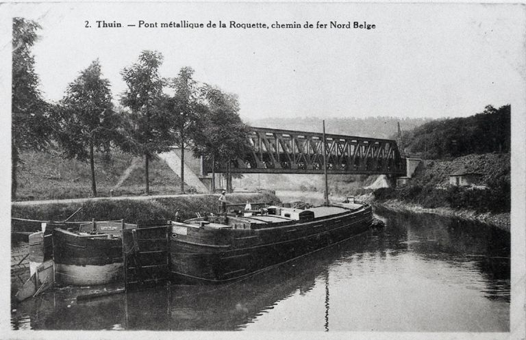 Reproductie van een postkaart met als opschrift '2.Thuin Pont métallique de la Roquette, chemin de fer Nord Belge'. De postkaart toont een metalen spoorwegbrug over de Samber. Twee binnenvaartschepen liggen aan het jaagpad.