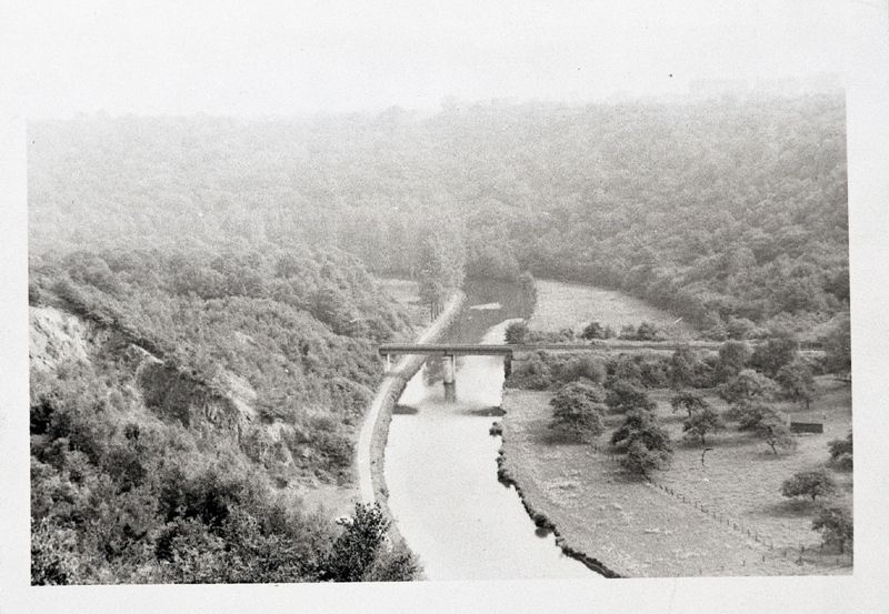 BeschrijvingReproductie van een postkaart zonder opschrift. De postkaart toont een panoramisch zicht op een metalen spoorwegbrug met stenen peilers.