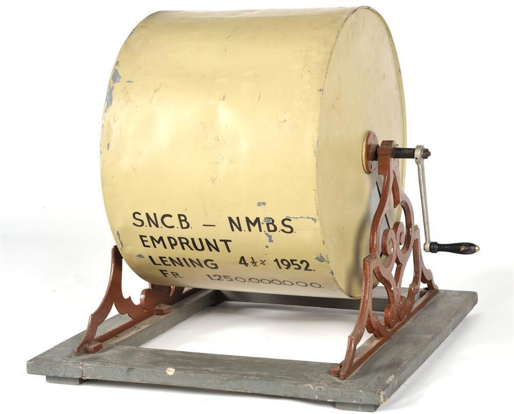 De trommel werd gemonteerd op een staander met smeedwerk. Bovenaan is er een luikje om de lotjes of balletjes in de trommel te gooien. Opzij bevinden zich een hendel om de trommel te draaien en een glazen doorkijkje. Bovenaan staat het opschrift 'S.N.C.B. N.M.B.S. emprunt lening 4 1/2 % 1952 Fr. 1.250.000.000'.