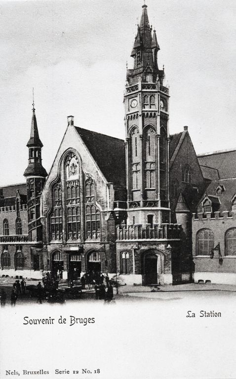 Reproductie van een postkaart met als opschrift 'Souvenir de Bruges La Station Nels, Bruxelles Serie 12 No. 18'. De postkaart toont een deel van de voorgevel en de monumentale ingang van het station.