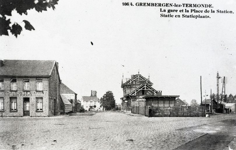 Reproductie van een postkaart met als opschrift '106/4. Grembergen-lez-Termonde. La gare et la Place de la Station. Statie en Statieplaats.' De postkaart toont de zijgevel van het station en de overweg gezien vanop het stationsplein.