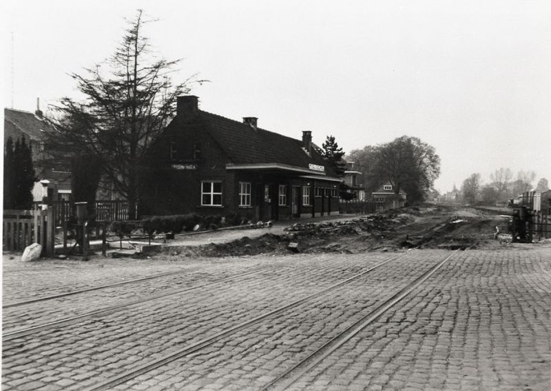 BeschrijvingReproductie van een postkaart zonder opschrif. De postkaart toont de achtergevel van het station. Ter hoogte van het stationsgebouw zijn de sporen opengebroken.