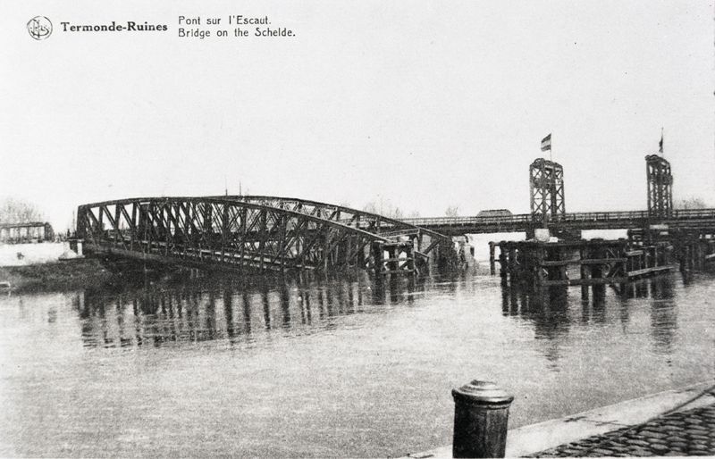 Reproduction d’une carte postale avec comme inscription “Termonde-Ruines Pont sur l'Escaut. Bridge on the Schelde”. La carte postale montre un pont détruit et un deuxième à l’arrière-plan.