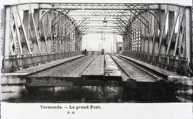 BeschrijvingReproductie van een postkaart met als opschrift 'Termonde - Le grand Pont. N. 35'. De postkaart toont het wegdek en de sporen die over een metalen brug lopen.