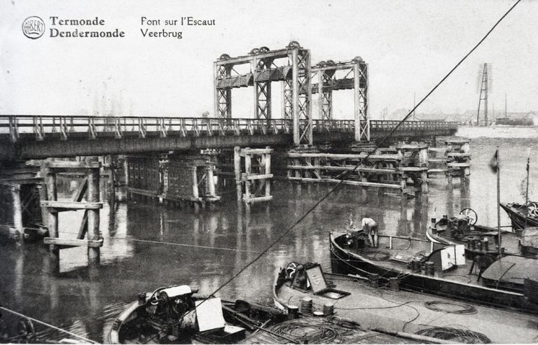 Reproductie van een postkaart met als opschrif 'Termonde Pont sur l'Escaut Dendermonde Veerbrug'. De postkaart toont een metalen hefbrug op houten peilers. Voor de brug liggen verschillende binnenschepen.