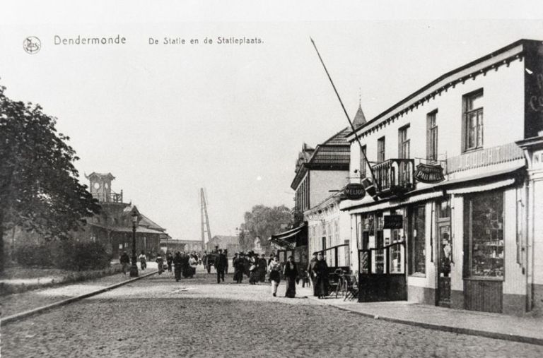Reproductie van een postkaart met als opschrift 'Dendermonde De Statie en de Statieplaats.' We zien op de achtergrond een deel van de voorgevel en de uurwerktoren van het station. Mensen lopen langs de woningen op de straat die naar het station leidt.