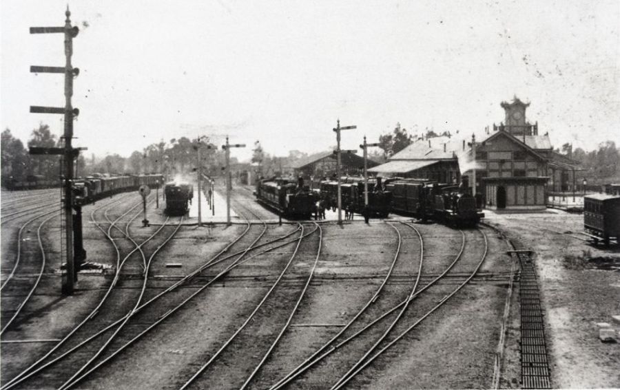 Reproductie van een postkaart zonder opschrift. De foto toont de zijgevel en de uurwerktoren van het station.We zien het sporencomplex aan het stationsgebouw en verschillende stoomtreinen die aan de perrons staan. Aan de uiteinden van de perrons staan mechanische seinen.
