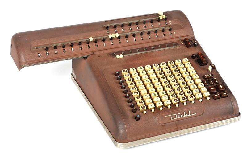 Deze bruine rekenmachine heeft negen rijen toetsen om nummers te vormen en verschillende bewerkingstoetsen. Met deze rekenmachine kon men grote getallen optellen en aftrekken. Het resultaat verscheen bovenaan. Bij de machine hoort een elektriciteitsdraad.
