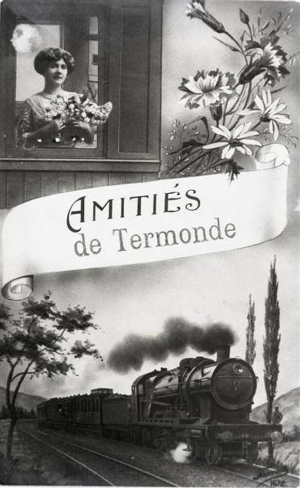 Reproductie van een postkaart met als opschrift 'Amitiés de Termonde 1673'. De postkaart toont onderaan een stoomtrein die door een landschap rijdt. Bovenaan staat in een rechthoek een vrouw die bloemen aanbiedt.Op de rest van kaart staan bloemen afgebeeld en een banderol met het opschrift op gedrukt.