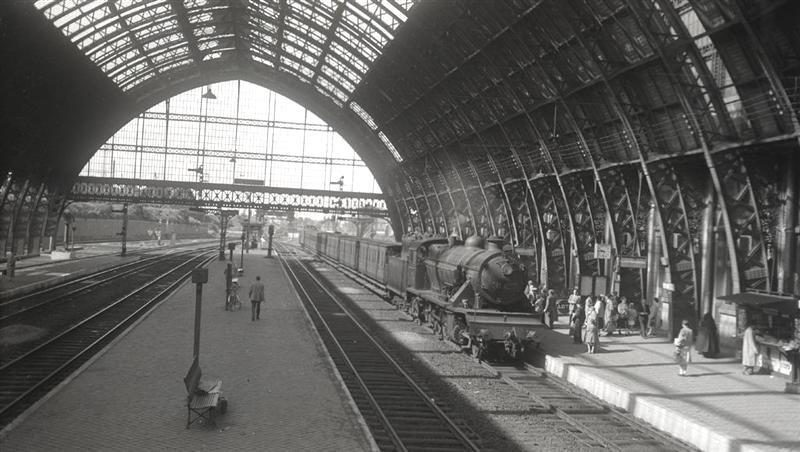 Deze foto werd getrokken in de overdekte sporenhal van station Mechelen. Stoomlocomotief 31.127, die deel uitmaakt van het type 31 (1D Consolidation), trekt haar tender en enkele GCI-rijtuigen. Op het perron wachten reizigers.