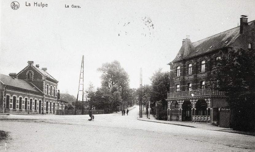 BeschrijvingReproductie van een postkaart met als opschrift 'La Hulpe La Gare'. Links zien we de voorgevel van het stationsgebouw. Op het stationsplein lopen enkele voorbijgangers.