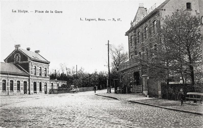 BeschrijvingReproductie van een postkaart met als opschrift 'La Hulpe. Place de la Gare L. Lagaert, Brux. - N.17.' Links zien we een deel van de voorgevel van het stationsgebouw. Rechts staat een hotel.