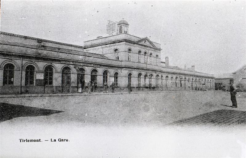 BeschrijvingReproductie van een postkaart met als opschrift 'Tirlemont. - La Gare.' De postkaart toont de voorgevel van het station en het stationsplein. Enkele personen poseren aan de ingang.
