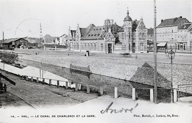 Reproductie van een postkaart met als opschrift '14. - Hal. - Le canal de Charleroi et la gare. Phot. Bertels, r. Laeken, 80, Brux.' De postkaart toont de zij- en voorgevel van het station, gefotografeerd van over het kanaal. Links staan enkel wagens bij een loods.