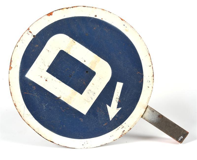 Rond blauw seinbord met witte omlijsting, de letter 'D' en een pijl die naar linksonder wijst. Deze letter (of cijfer) werd gekoppeld met een stopsein of rangeerarm. Bij het opzetten van het sein kwam de letter of het cijfer te voorschijn van het spoor dat bereden mocht worden.