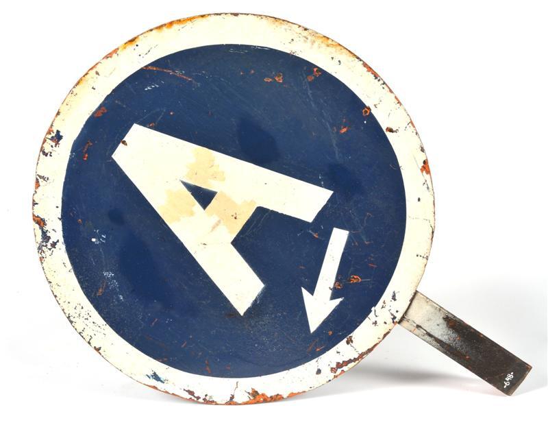 Rond blauw seinbord met witte omlijsting, de letter 'A' en een pijl die naar linksonder wijst. Deze letter (of cijfer) werd gekoppeld met een stopsein of rangeerarm. Bij het opzetten van het sein kwam de letter of het cijfer te voorschijn van het spoor dat bereden mocht worden.