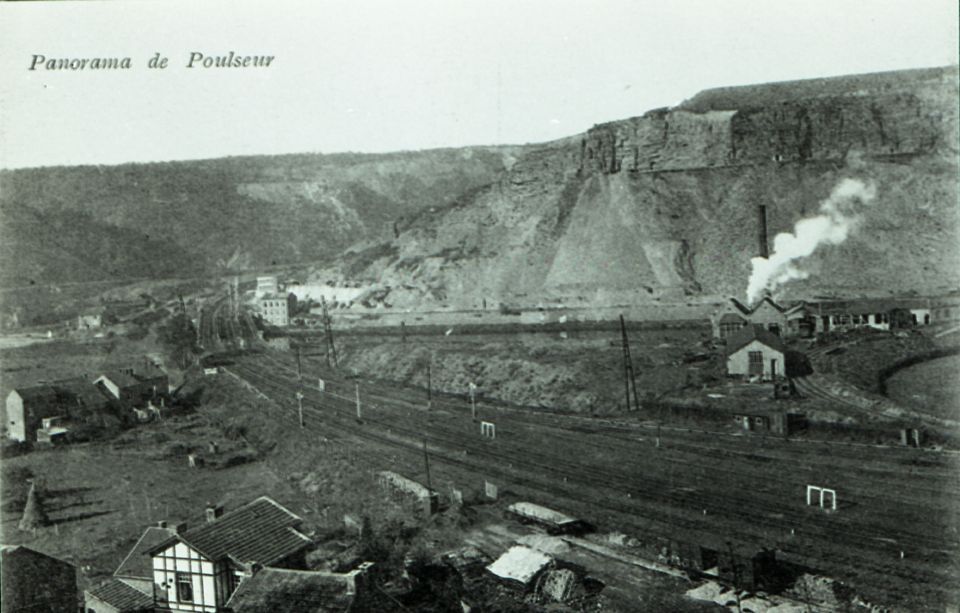 BeschrijvingReproductie van een postkaart met als opschrift 'Panorama de Poulseur'. Op de luchtfoto zien we het sporencomplex bij het station en de steengroeve.