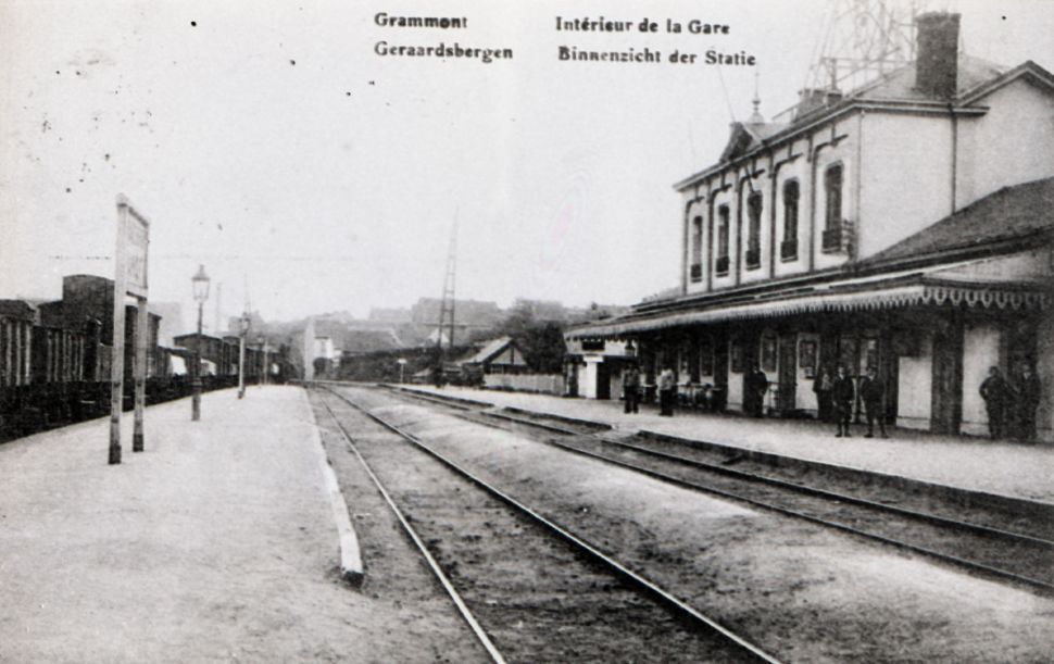 Reproductie van een postkaart met als opschrift 'Grammont Intérieur de la Gare Geraardsbergen Binnenzicht der Statie'. We zien de achtergevel van het station, gefotografeerd vanop het tussenperron. Enkele personen poseren onder de luifel. Links aan het tussenperron staat een goederentrein.