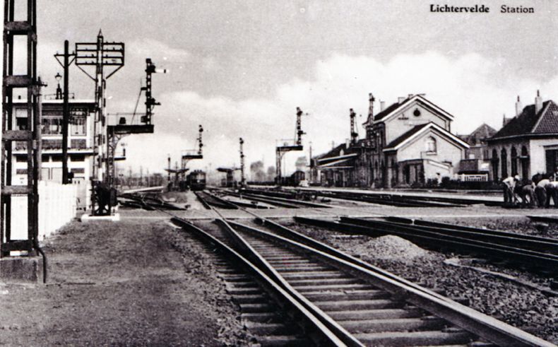 Reproductie van een postkaart met als opschrift 'Lichtervelde Station'. De postkaart toont de zijgevel van het station. Op de voorgrond kruisen verschillende sporen elkaar. Naast de sporen staan seinpalen en enkele gebouwen. Rechts zijn spoorleggers aan het werk. In de verte rijdt een dieseltrein het station binnen.