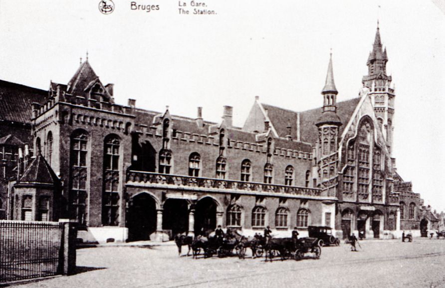 Reproductie van een postkaart met als opschrift 'Bruges La Gare. The Station.' De postkaart toont de voorgevel van het station en het stationsplein met voorbijgangers en koetsen.