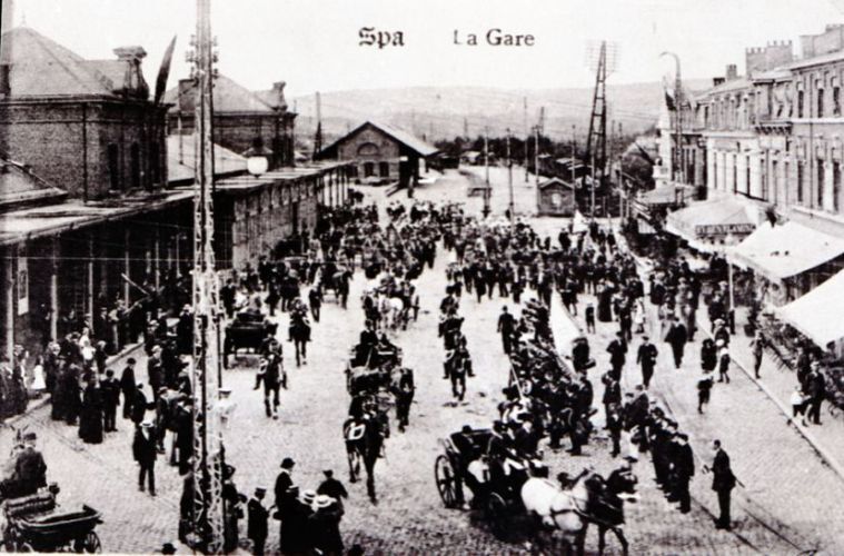 Reproductie van een postkaart met als opschrift 'Spa La Gare'. De postkaart toont links de voorgevel van het station. Een massa volk verwelkomt Leopold II na zijn aankomst te Spa. Begeleid door militairen te paard begeeft de stoet met hoogwaardigheidsbekleders zich naar het stadscentrum