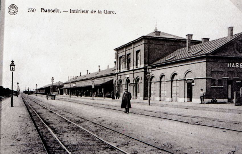 Reproductie van een postkaart met als opschrift '550 Hasselt. - Intérieur de la Gare.' De postkaart toont de achtergevel van het station, gefotografeerd van over de sporen. Een man poseert op het tussenperron.