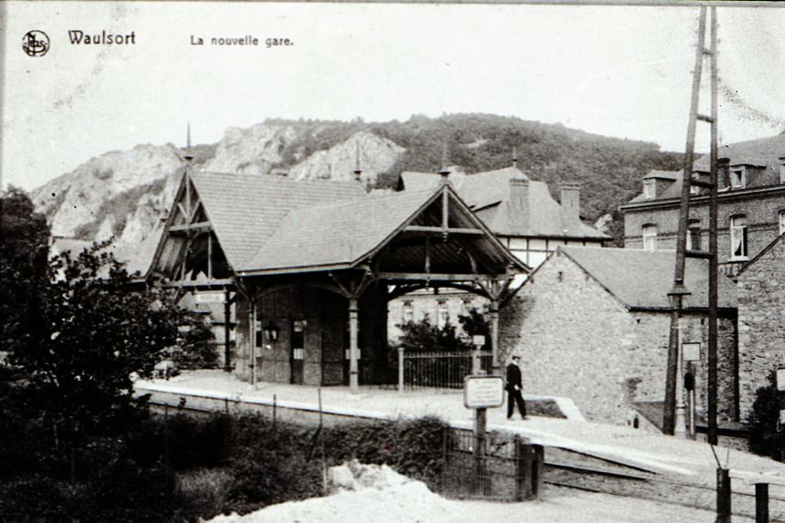 Reproductie van een postkaart met als opschrift 'station Waulsort La nouvelle gare'. De postkaart toont de achterzijde en het perron van het station.